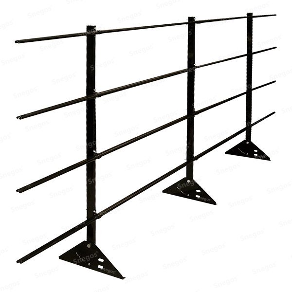 Стойки кровельного ограждения оснащены дополнительными технологическими отверстиями под систему снегозадержания (Внимание! Установка трубок снегозадержания допустима только в том случае, если на кровле уже установлены снегозадержатели, так как трубки, используемые в конструкции кровельного ограждения служат для удержания снежной массы на участке между линией снегозадержателей и кровельных ограждений. В противном случае нагрузка на стойки кровельного ограждения будет превышать допустимые нормы.)